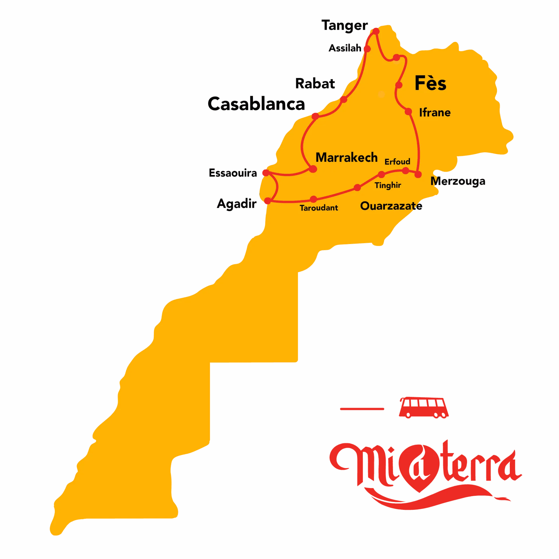 Un périple extraordinaire de Casablanca à Marrakech, en passant par Rabat, Tanger, Fès, Ifrane, Midelt, le désert à Merzouga, Erfoud, Tinghir, Ouarzazate, Taroudant et, ultimement, par les villes côtières d’Essaouira et Agadir !